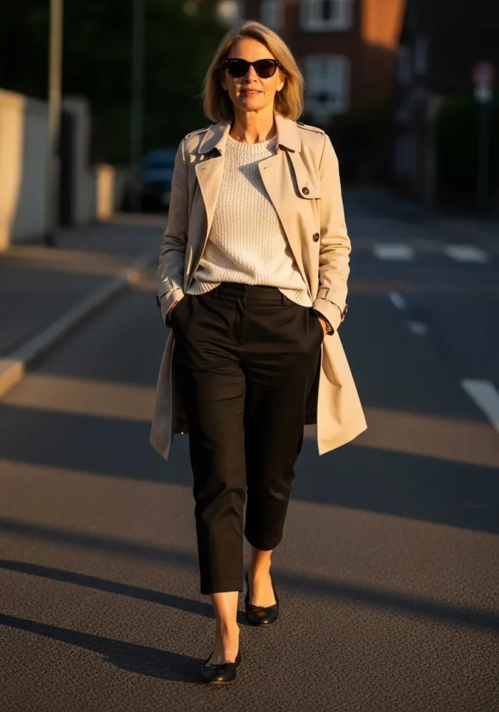 Here we see a lightweight beige trench styled over a soft blouse and black ankle trousers. The silhouette feels sleek and urban while still being very office appropriate. Neutral shoes and sunglasses give it that effortless city chic vibe that works beautifully in spring.