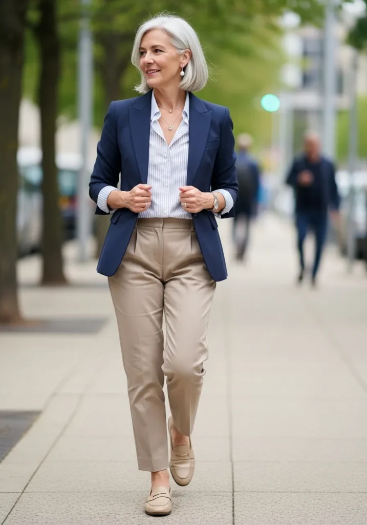 This look pairs a classic navy blazer with a white blouse and light beige trousers. The contrast between the dark blazer and lighter pants feels crisp and modern. The overall fit is tailored but relaxed enough to feel comfortable throughout the day.