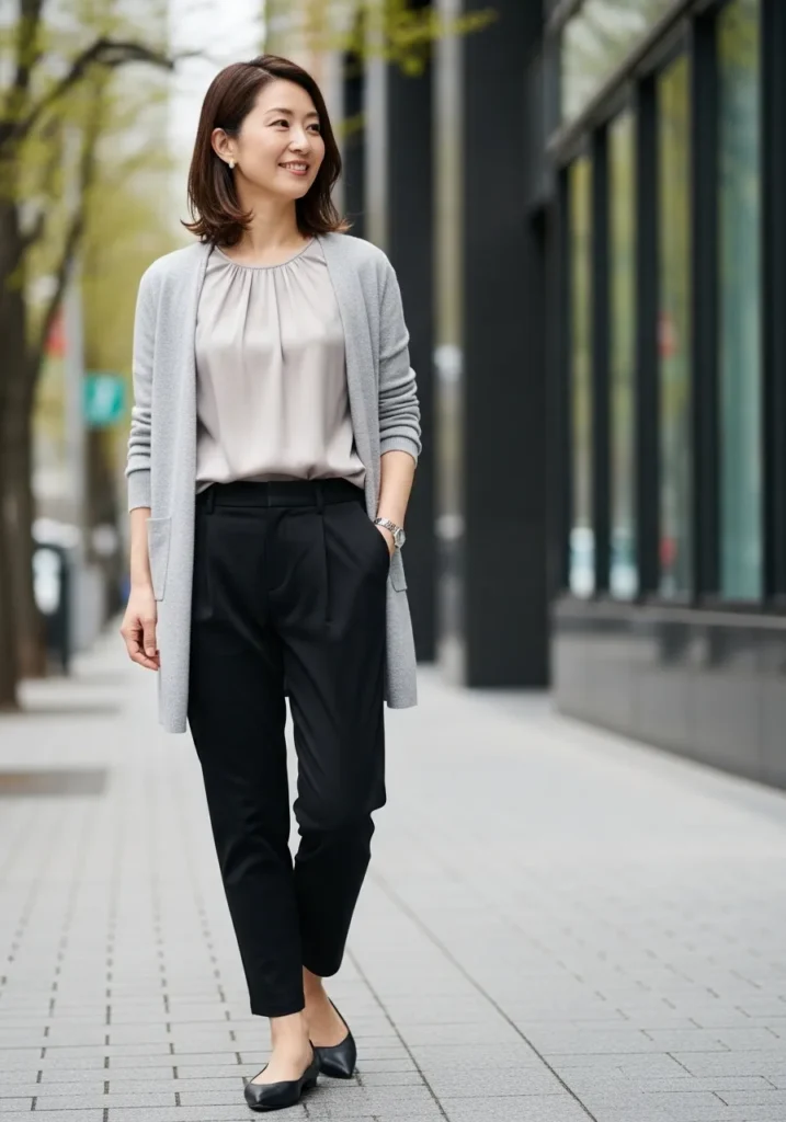 This outfit features a soft light cardigan layered over a neutral blouse and paired with slim black trousers. The fabrics look comfortable and breathable which makes it perfect for spring. Simple flats and minimal accessories keep the look clean and understated.