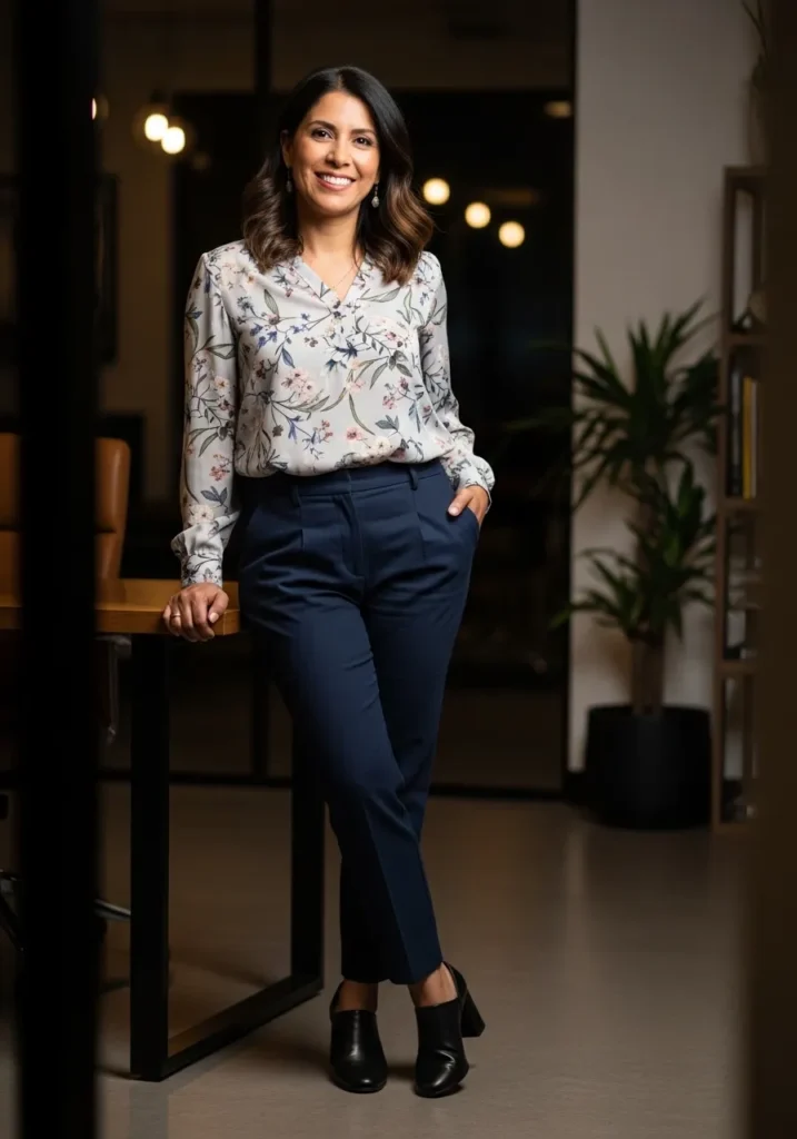 This is one of those looks I always reach for when I want to feel polished but not overly formal. The floral top keeps it from feeling too corporate, and the navy pants do all the heavy lifting in terms of structure. It feels flattering, grown up, and quietly stylish.