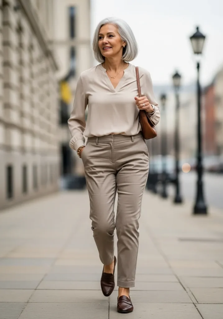 This look features a silky neutral blouse paired with slim taupe trousers that create a clean and elegant silhouette. The soft drape of the top contrasts nicely with the tailored pants, and the monochrome color palette feels calm and confident. Simple heels and minimal accessories keep the focus on the fit.