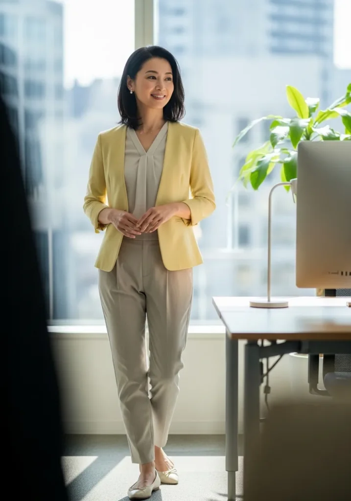 A light yellow blazer worn with matching tailored trousers gives this outfit a fresh spring energy while staying office appropriate. Underneath, a simple neutral top keeps the look grounded, and the soft tailoring prevents it from feeling too formal. The color instantly brightens the entire outfit.