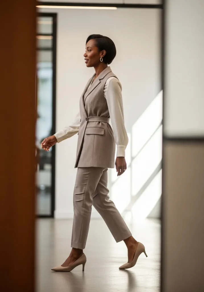 This modern neutral suit features a tailored blazer and matching trousers styled with a simple top underneath. The fit is sharp but not stiff, and the neutral color keeps it versatile and timeless. Paired with classic heels, the look feels confident and refined.