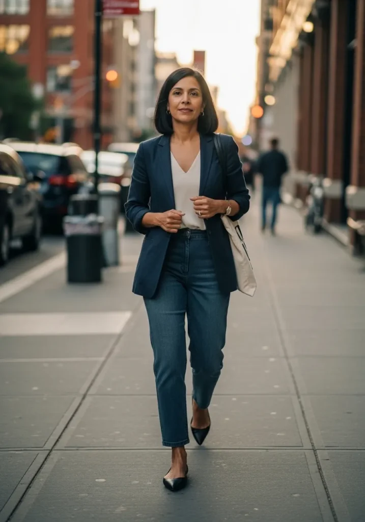 This look pairs a classic navy blazer with a simple top and dark wash denim styled in a clean and professional way. The blazer adds instant structure, while the jeans keep the outfit modern and approachable. Neutral heels finish the look beautifully.