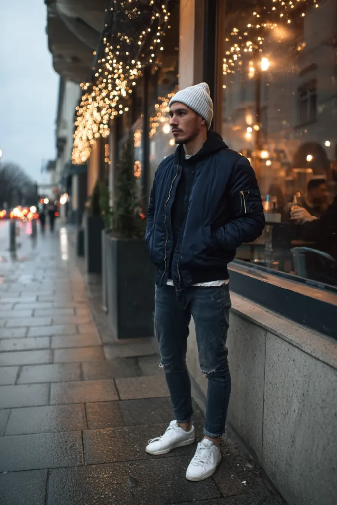 This outfit keeps things cool and easy with a navy bomber jacket layered over a black hoodie. The pairing feels laid back yet stylish, especially with the slim distressed jeans that add a bit of edge. White sneakers keep it fresh and casual, while the light gray knit beanie brings in that cozy winter vibe. The overall look is modern, street smart, and perfect for cold city nights.