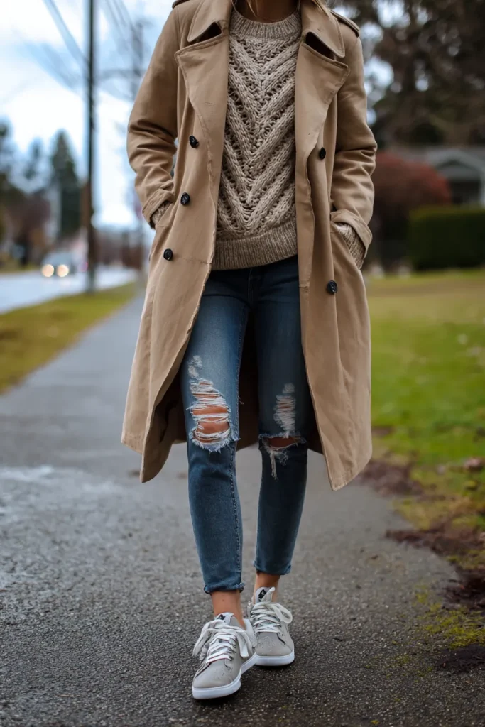 This look brings together classic and casual in the best way. A beige trench coat layers perfectly over a textured chunky knit sweater, giving it warmth and dimension. The ripped skinny jeans add a relaxed, edgy touch that keeps the outfit from feeling too polished. White sneakers tie it all together, making the whole vibe laid back but still stylish enough for a winter stroll.