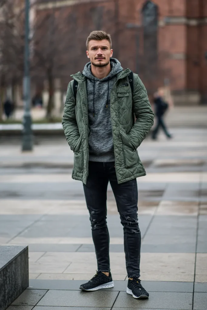 This look is the perfect mix of sporty and casual. A quilted olive green jacket adds structure and warmth while a gray hoodie underneath keeps it relaxed and easygoing. The dark distressed skinny jeans bring in some edge, and black sneakers finish the outfit with a modern streetwear vibe. The backpack ties it all together, making it practical for an everyday winter look.