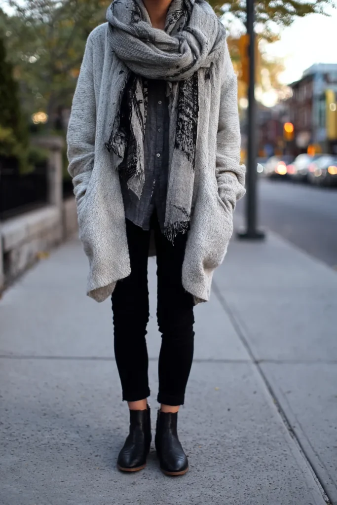 This outfit is the definition of cozy chic. A soft oversized gray cardigan sets the tone, layered over a simple dark shirt for contrast. The chunky scarf wrapped loosely around the neck adds extra warmth and style, while fitted black jeans balance out the oversized top half. Black leather ankle boots finish the look with a sleek edge, making it perfect for winter days that call for both comfort and polish.