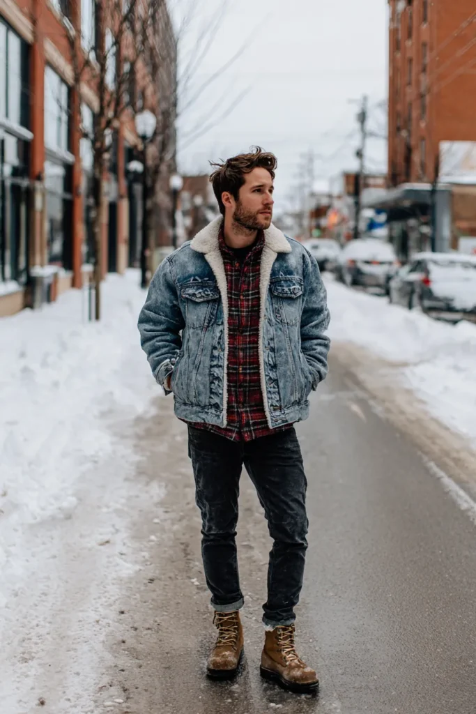 This outfit layers rugged pieces in the best casual way. A light wash denim jacket with a sherpa lining gives warmth and texture while a red plaid flannel shirt underneath adds that classic winter touch. Black jeans keep the look grounded and slim, and tan lace-up boots bring in a sturdy finish that’s perfect for snowy streets. The overall vibe is relaxed and outdoorsy but still really put together.