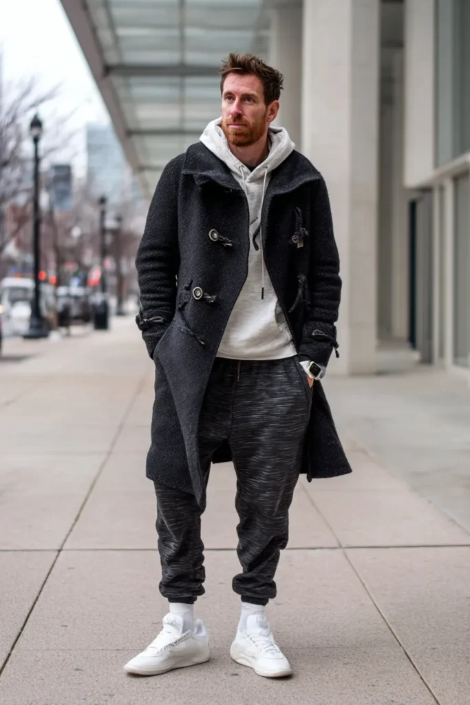 This outfit blends polished and sporty in the coolest way. A long charcoal toggle coat creates structure and warmth, layered casually over a light gray hoodie for that relaxed streetwear vibe. Dark jogger pants add comfort while still looking sleek, and clean white sneakers tie the whole look together with a crisp finish. The mix of tailored outerwear and laid-back pieces gives it an effortlessly modern feel.