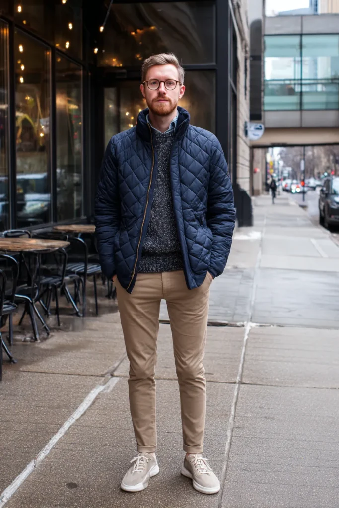 This outfit is the perfect mix of casual polish and winter comfort. A navy quilted jacket adds structure while keeping it lightweight and warm. Underneath, a textured charcoal sweater gives depth and coziness. Slim beige chinos balance the darker tones, and neutral sneakers keep the look grounded and easy to wear. The vibe is simple, clean, and effortlessly stylish.