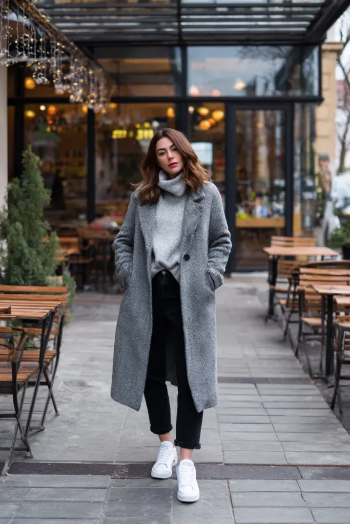 This look balances timeless tailoring with relaxed winter comfort. The long gray coat has a subtle herringbone texture that feels refined without being too formal. Underneath, a chunky gray turtleneck sweater adds warmth and softness, while black cuffed jeans bring in a casual edge. White sneakers finish the outfit with a clean, fresh touch that keeps the vibe modern and approachable.