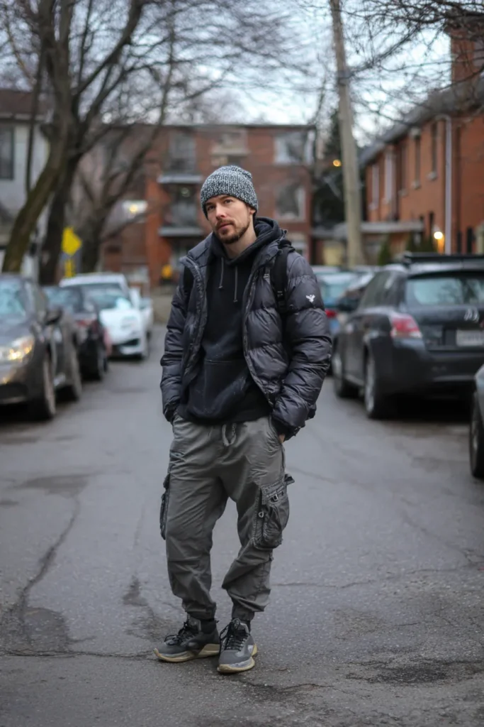 This outfit leans into a sporty and rugged winter vibe. A black puffer jacket keeps the look warm and practical, layered over a dark hoodie for extra coziness. Gray cargo joggers with plenty of pocket detail add that utilitarian touch, while black and gray sneakers finish it off with an easygoing streetwear edge. The knit beanie ties it all together, giving a casual finish that feels perfect for cold city days.