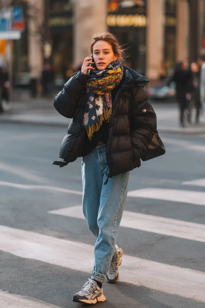 This outfit is cozy and full of personality. A black oversized puffer jacket sets the foundation, layered over a chunky knit for warmth. The standout piece is the bold patterned scarf in rich jewel tones, adding a playful pop of color against the dark jacket. Light blue relaxed-fit jeans keep the look casual, and chunky sneakers make it street smart and practical for winter city walks.