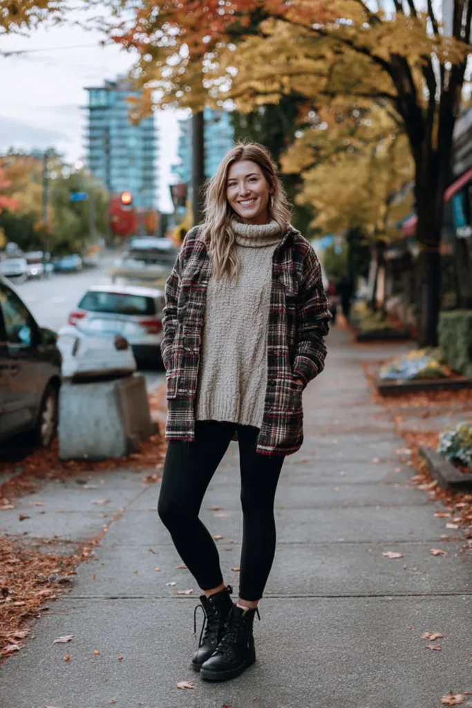This outfit is the perfect mix of cozy and casual. A soft oversized plaid shacket brings warmth and color, layered over a chunky beige turtleneck sweater that feels snug and stylish. Black leggings keep the look sleek and comfortable, while lace-up combat boots add a little edge. The whole vibe is relaxed, trendy, and perfect for chilly winter days.