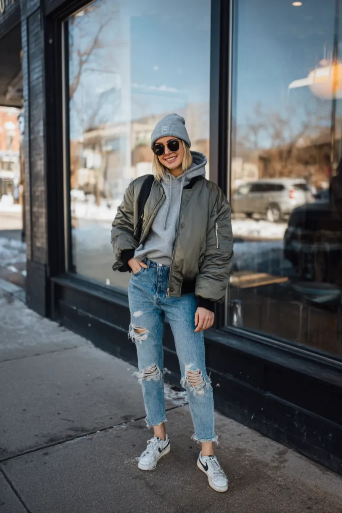 This outfit has that effortless street style vibe. A gray hoodie forms the base layer, topped with an olive green bomber jacket that adds just the right amount of edge. Light wash ripped jeans bring a casual and laid-back feel, while classic white sneakers keep it sporty and fresh. The gray knit beanie and round sunglasses pull it all together, making it the perfect winter casual look.