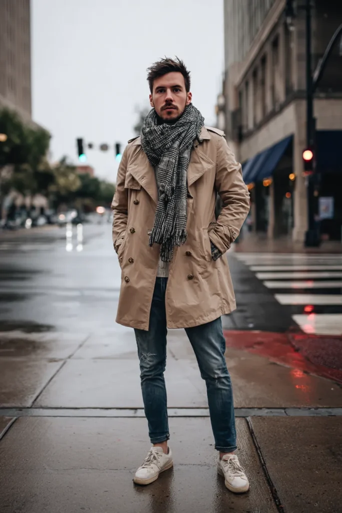 This outfit is a classic winter look with a casual twist. A beige trench coat gives structure and polish, while the oversized plaid scarf adds both warmth and texture. Slim blue jeans keep the outfit relaxed, and white sneakers bring in a laid-back vibe that makes it perfect for everyday wear. The whole look feels sleek, modern, and easy to pull off.