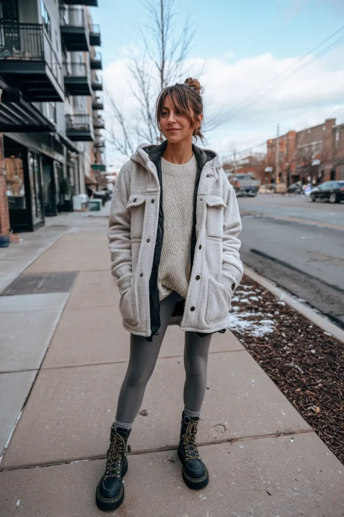 This outfit nails that cozy casual look we all want on a chilly day. A soft oversized cream jacket layered over a chunky knit sweater creates instant warmth, while sleek gray leggings keep the outfit comfortable yet polished. Black lace up boots with gold-detailed laces add just the right amount of edge, making this look winter ready and street chic at the same time.