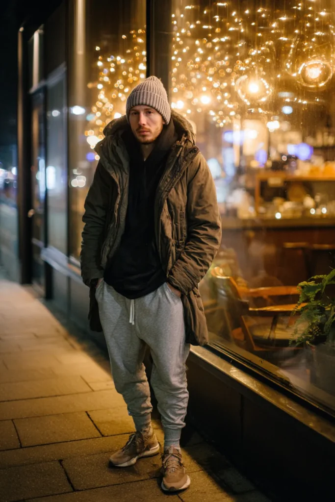 This look combines laid back comfort with practical winter layering. A dark olive parka with a hood keeps things warm on chilly nights, while a black hoodie underneath adds an easy casual touch. The light gray joggers balance the darker top layers and bring a soft, relaxed feel. Tan sneakers and a ribbed gray beanie round out the outfit, giving it a grounded and cozy streetwear vibe.