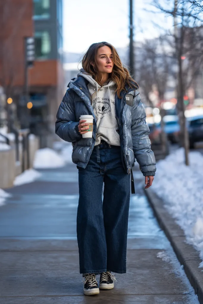 This look mixes sporty comfort with casual chic, thanks to the shiny gray puffer jacket layered over a light gray hoodie with a playful graphic. The wide leg dark denim jeans balance the cropped fit of the jacket, giving the outfit a relaxed but polished shape. Finished with classic high-top sneakers, it feels cool and practical while still being stylish enough for a coffee run in the snow.