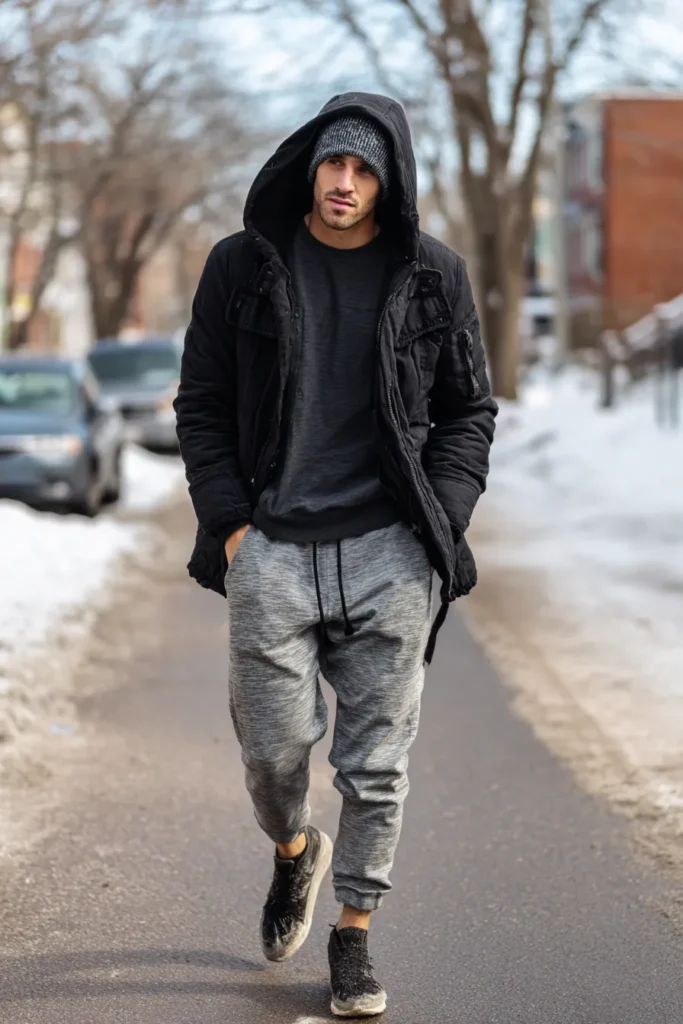 This outfit is all about effortless winter comfort. A dark gray hoodie forms the base, layered with matching jogger pants that bring an easy and casual vibe. Over the top sits an olive parka with utility pockets, adding both warmth and a rugged touch. Worn-in sneakers finish the look, keeping it practical and relaxed for a chilly day out.