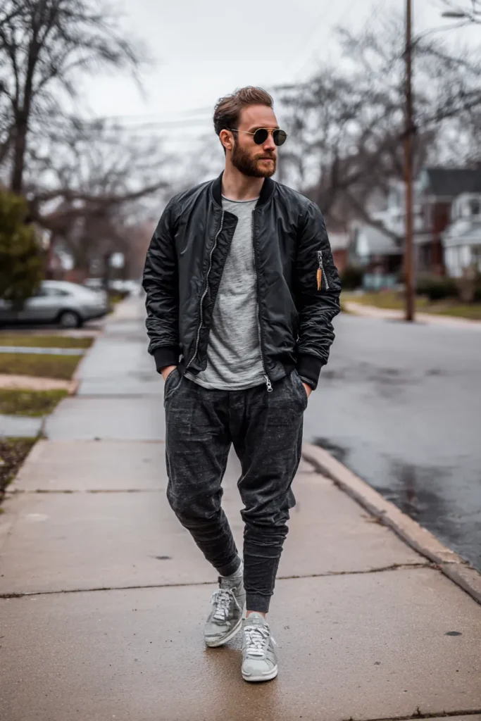 This outfit pairs a sleek black bomber jacket with a light gray tee for an easy, everyday base. Dark jogger-style pants keep the look comfortable while adding a touch of streetwear style. Worn-in gray sneakers tie it all together, and the aviator sunglasses give it a cool finishing touch that feels effortlessly confident. The palette stays muted, making it a versatile go-to look for casual winter days.
