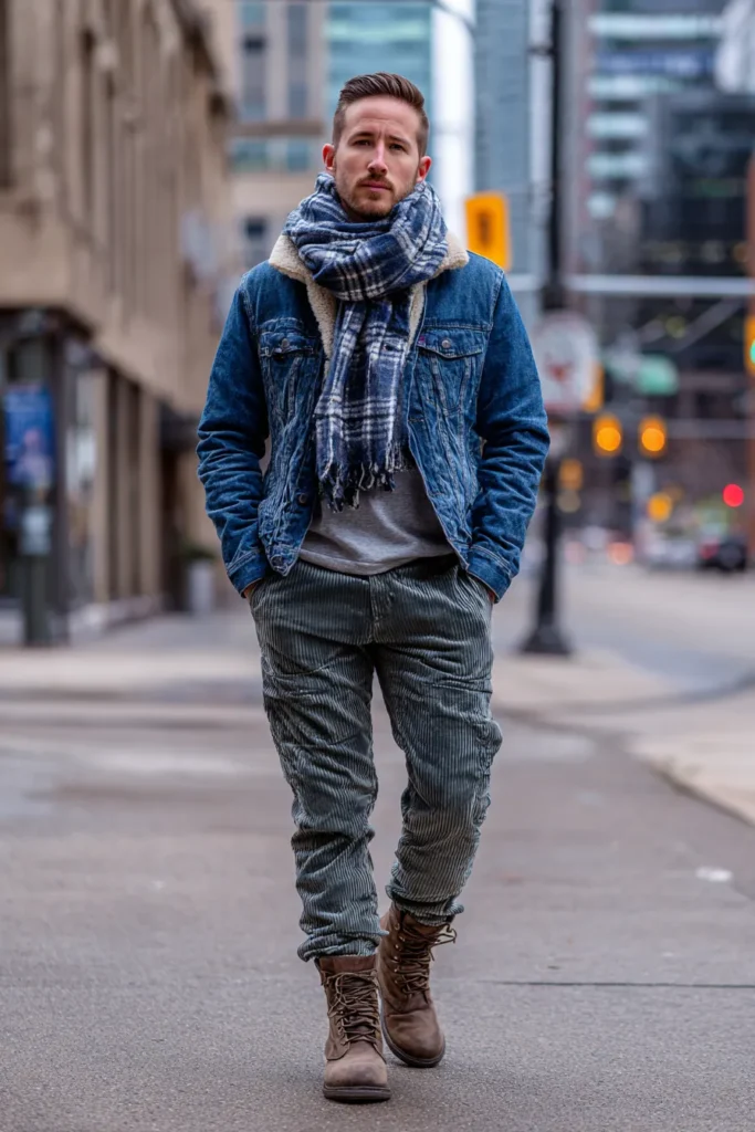 This outfit blends rugged charm with cozy warmth, thanks to the shearling-lined denim jacket layered over a simple gray tee. The standout piece is the oversized plaid scarf in shades of navy and white, adding both texture and a stylish accent. Olive corduroy pants bring in a vintage vibe, while lace-up brown boots keep the look grounded and practical for cold days in the city.