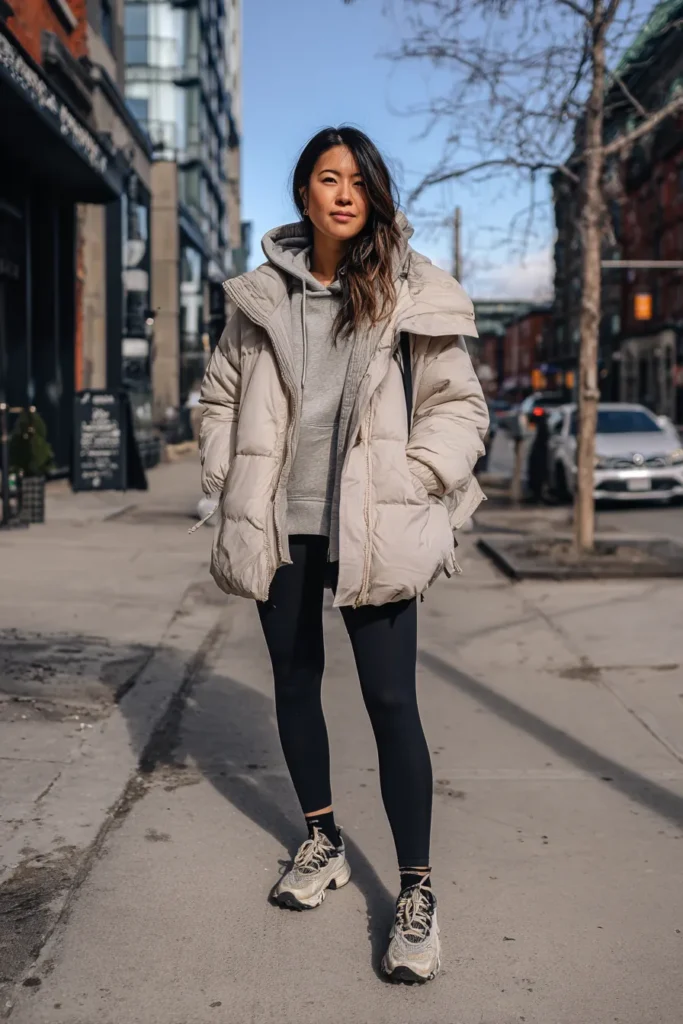 This outfit keeps things effortless and cozy with a soft beige oversized puffer jacket layered over a classic gray hoodie. Black leggings streamline the look, giving it that sleek athleisure vibe, while chunky sneakers add both comfort and a touch of streetwear energy. The whole outfit balances warmth and ease, perfect for a winter day out when you want to stay casual but still look styled.